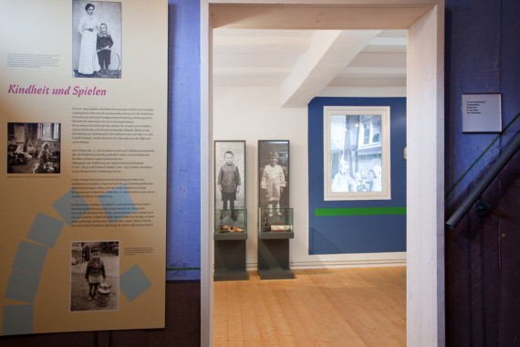 Die Präsentation gliedert sich in die Themen Kindheit, Jungenspielzeug, Mädchenspielzeug, Spiele für alle, Spiele im Freien und bewegte Bilder. Ein Raum mit historischen Möbeln und Unterrichtsmaterialien widmet sich dem Thema Schule.